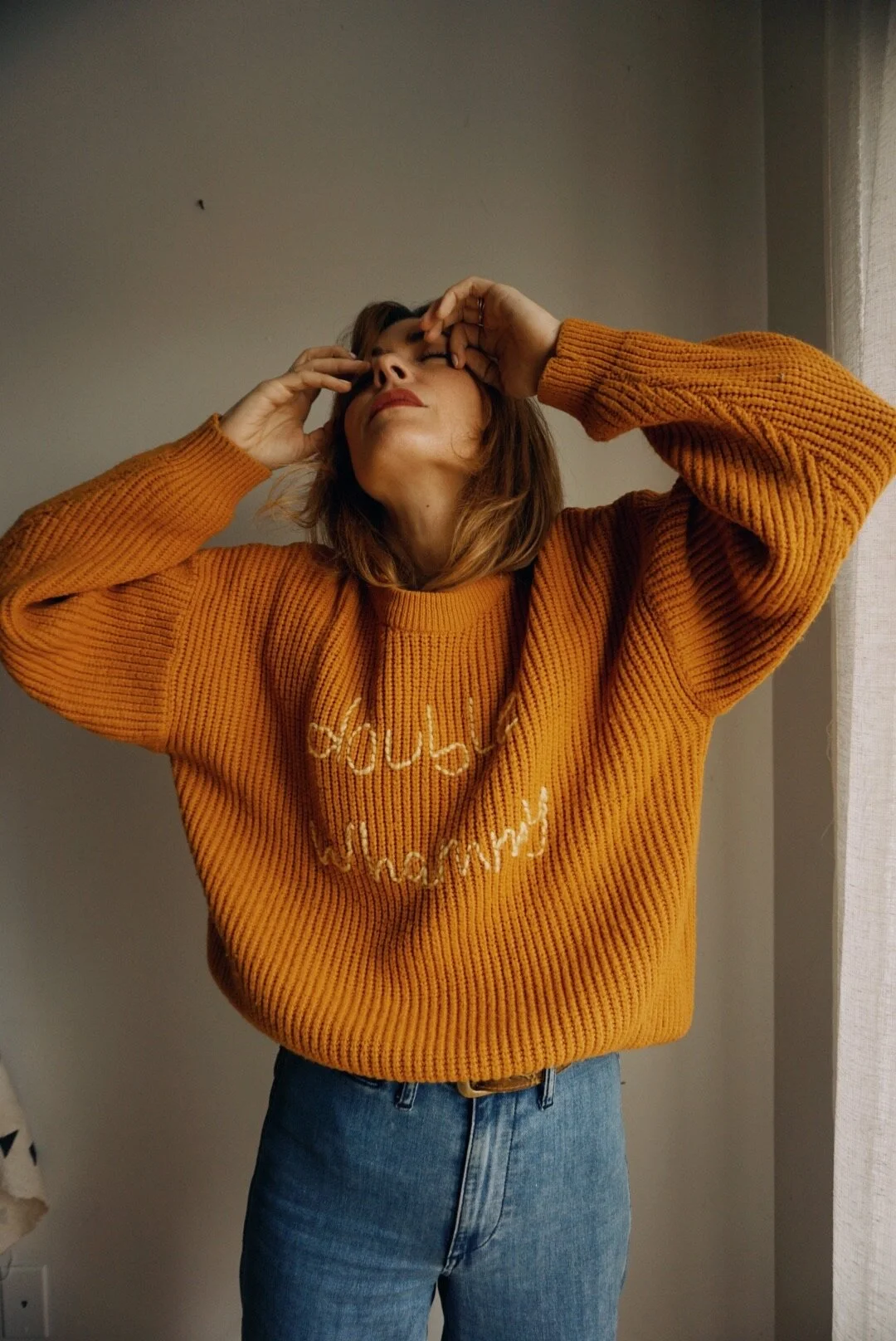 I thrifted this sweater and then embroidered “Double Whammy” on it for a truly one of a kind piece!