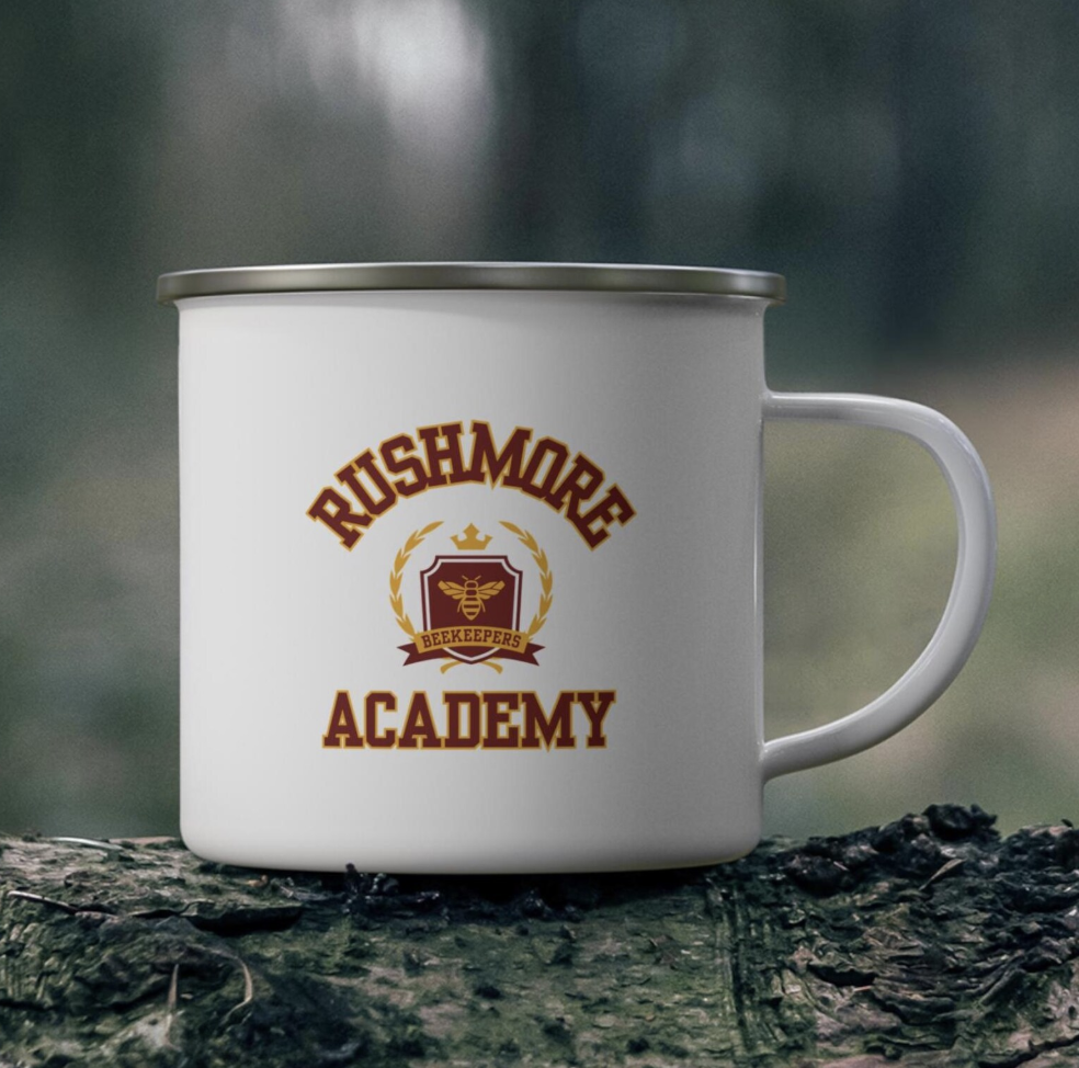 A Rushmore Academy enamel mug featuring the school's iconic crest. Perfect for sipping coffee while channeling your inner Max Fischer – overachiever extraordinaire.