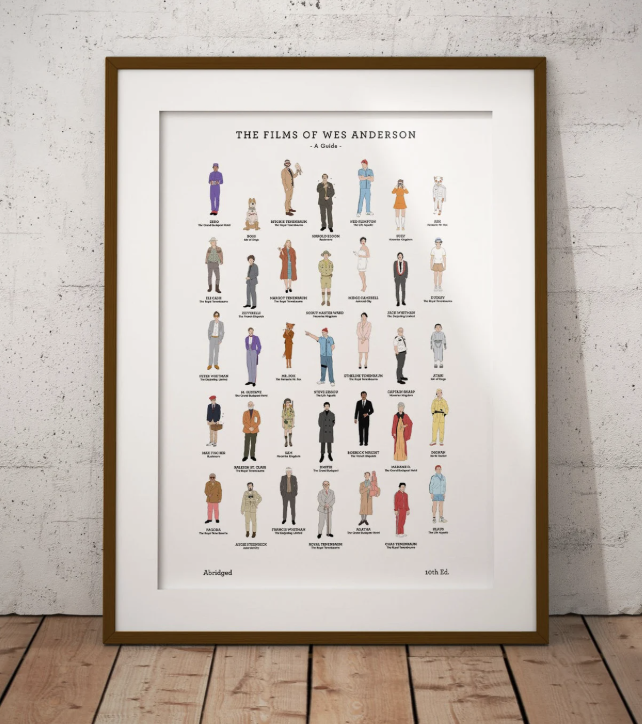 A charming illustrated print showcasing Wes Anderson's iconic characters – the perfect wall art for any fan's collection.